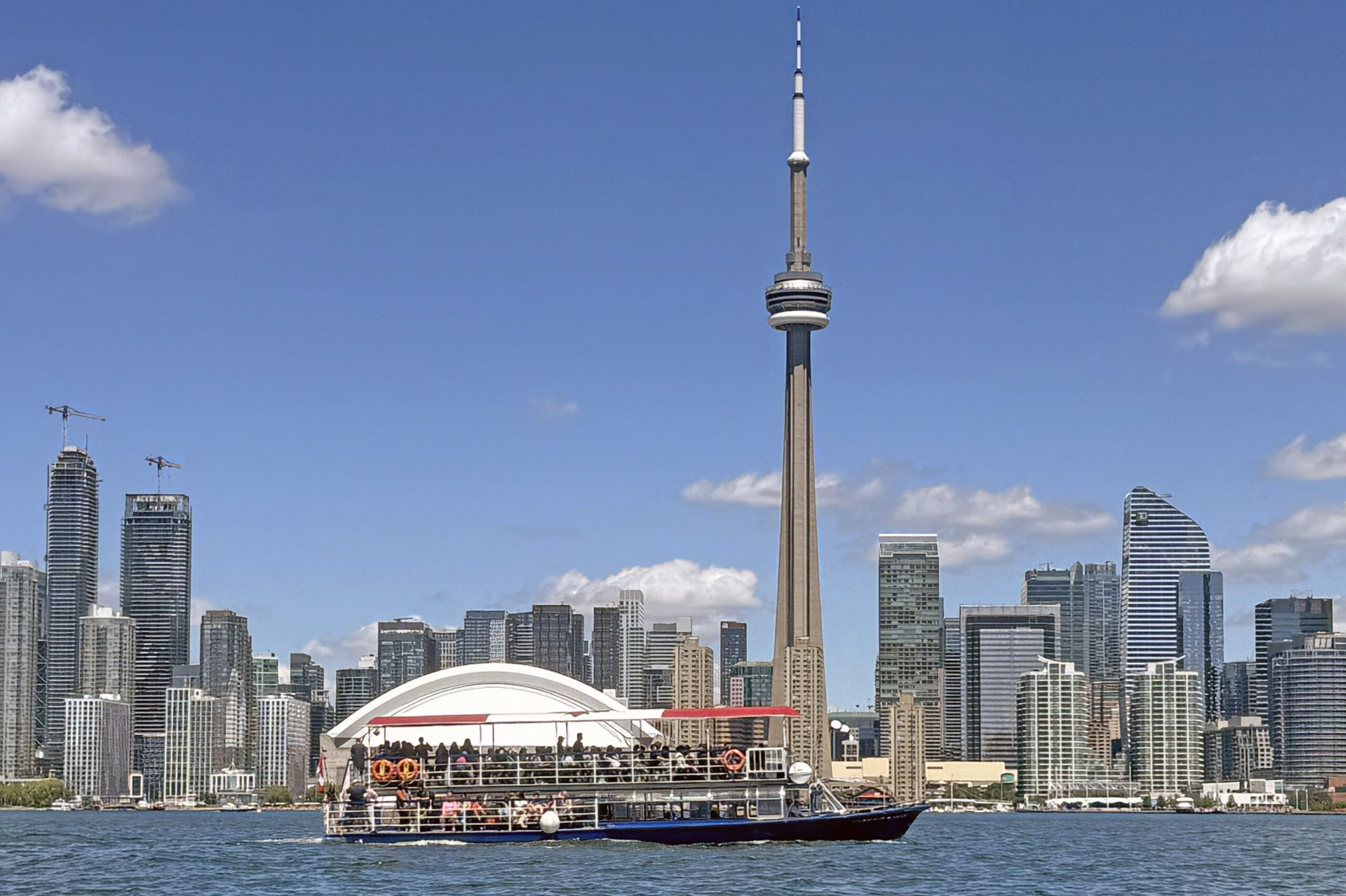 The cruise features a live guide delivering an entertaining and informative commentary as the boat winds its way through the Toronto Inner Harbour and the 14 Islands. Three distinct seating options are available: outdoors under the canopy on the upper deck, outdoors on the water-level sundeck, and inside at tables on the lower level. The lower level also houses washrooms and a bar. The harbour and islands cruise is available from May through October. The cruise lasts 45 minutes.