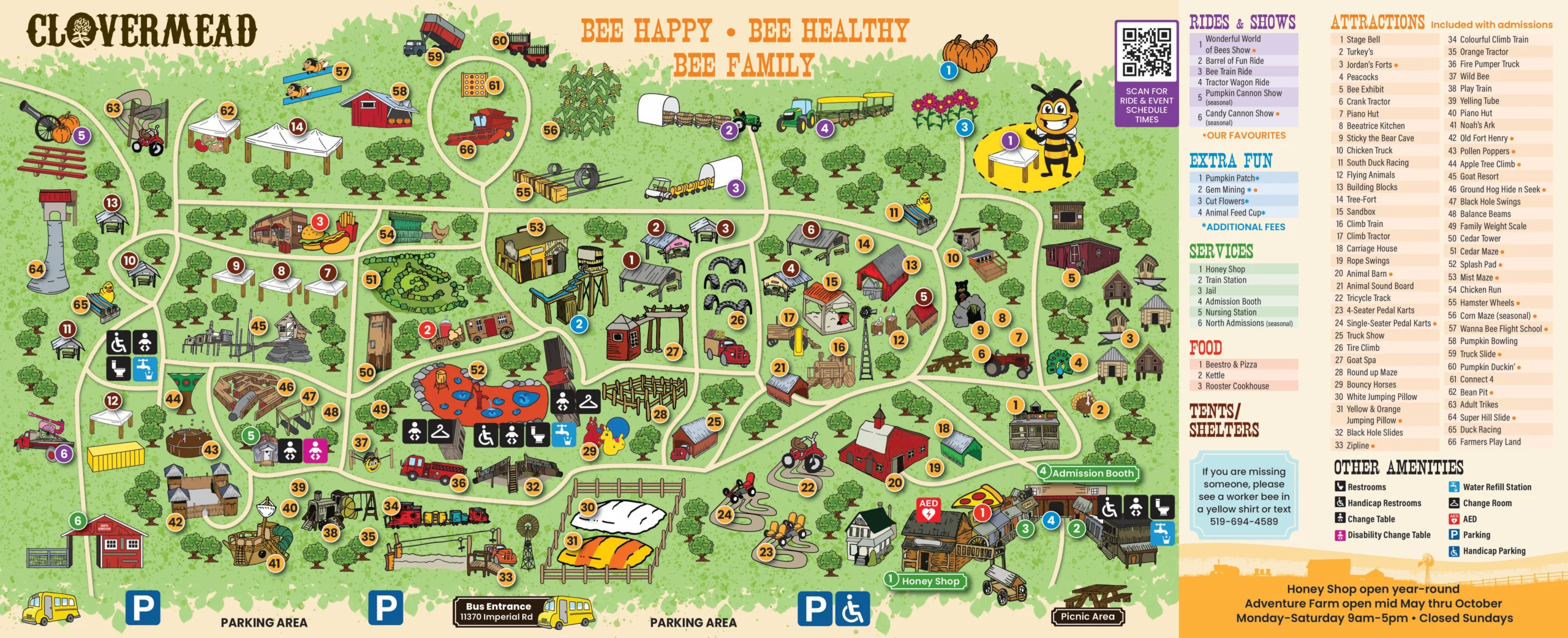Open from the May Long Weekend to October 31, Clovermead features farm animals, interactive play areas, great food and homemade donuts, shaded seating, group shelters, and a year-round Honey Shop showcasing Clovermead honey and local Ontario products.